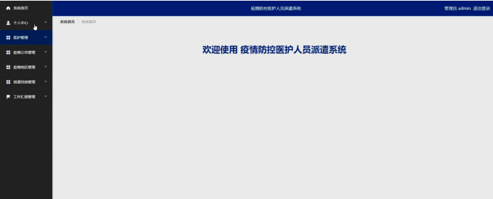 管理员进入系统后台后,可以对个人中心、医护管理、疫情公告管理、疫情地区管理、派遣信息管理、工作汇报管理等功能模块进行管理。管理员功能界面图如图5-2所示。