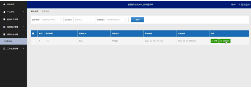 点击疫情派遣管理,进入到疫情派遣管理页面,医护人员可以查看医护编号、医护姓名、派遣地点、开始时间、结束时间等详情,派遣任务结束之后,医护人员可以添加工作汇报进行反馈,疫情派遣管理页面如图5-13所示。