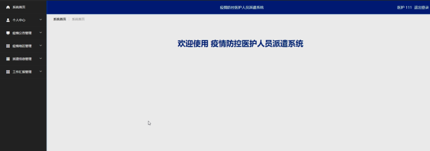 医护人员登录到用户后台功能模块界面后,可以对个人中心、疫情公告管理、疫情地区管理、派遣信息管理、工作汇报管理等功能模块进行管理。医护功能界面图如图5-10所示。