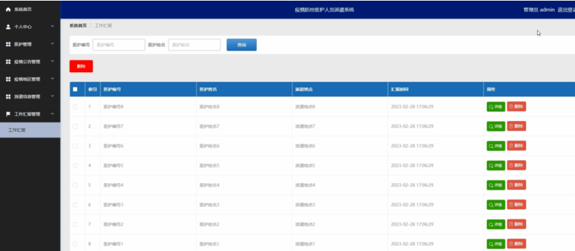 点击工作汇报管理,管理员可以浏览医护人员发布的工作汇报详情,并进行查询、删除的操作,工作汇报管理界面图如图5-9所示。