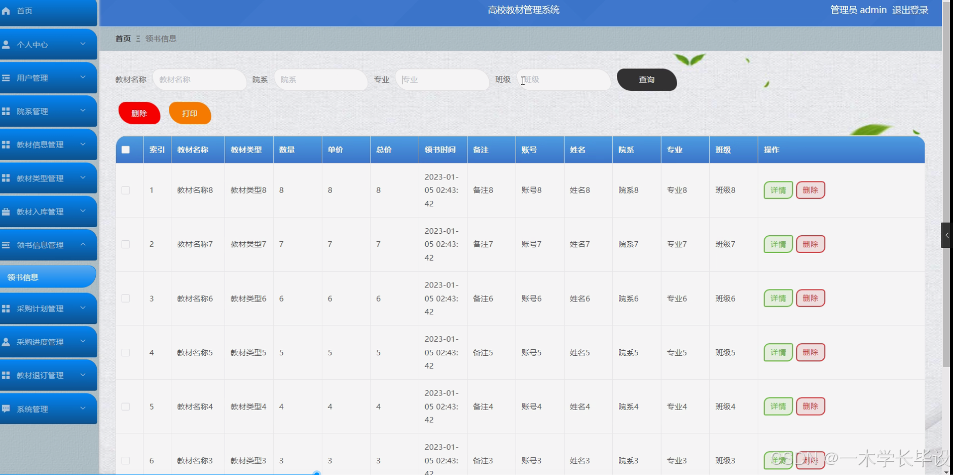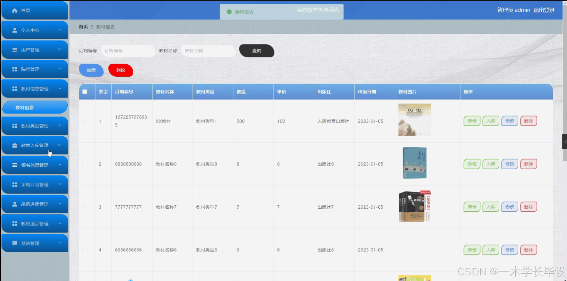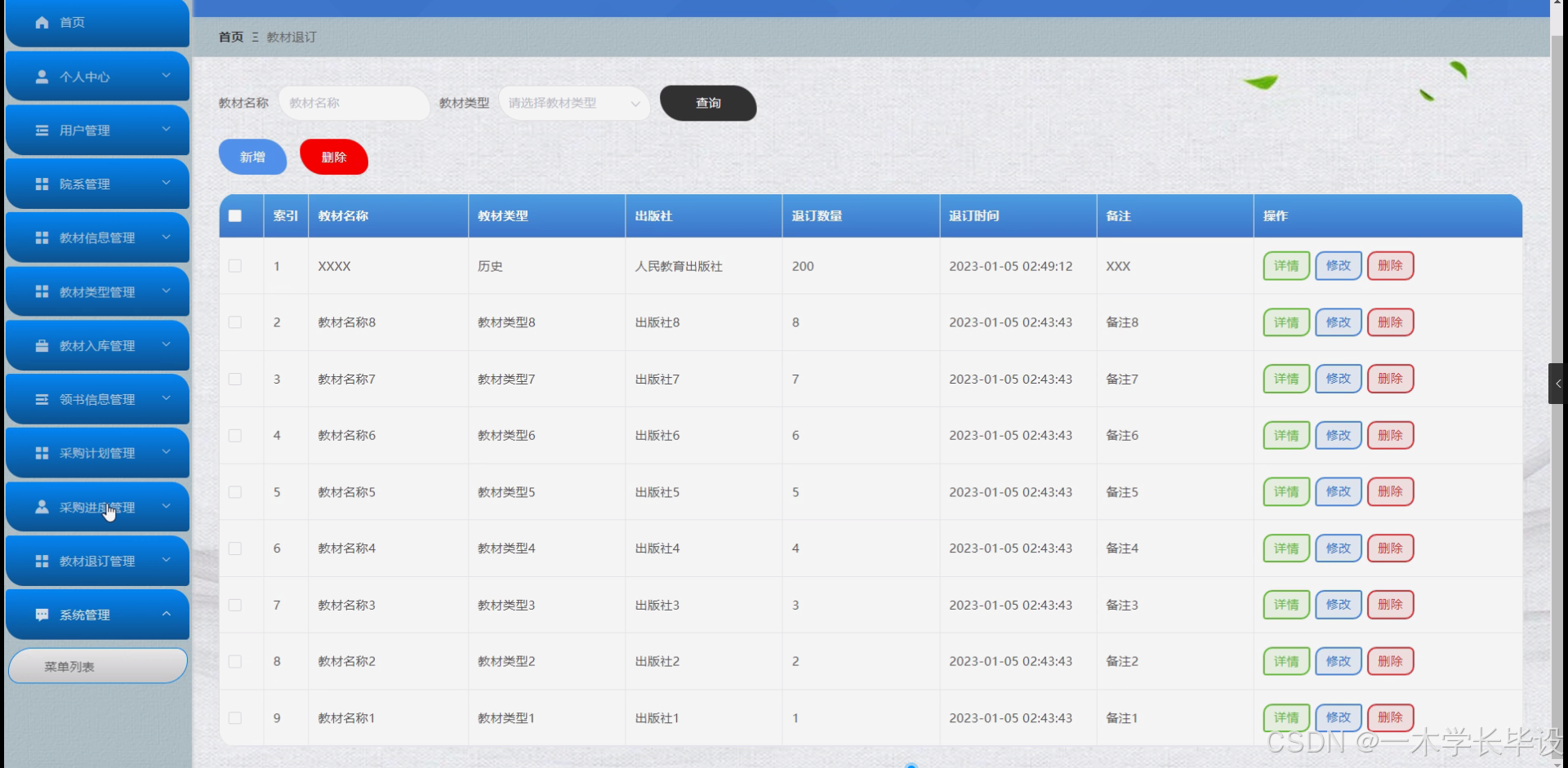 高校教材管理系统的开发对于提升高校教材管理水平、优化教学资源配置具有重要意义。一方面,该系统能够简化教材管理流程,减少人工操作,提高工作效率;另一方面,通过信息化手段,系统能够实时跟踪教材的入库、出库、征订和退订情况,确保教材信息的准确性和及时性。此外,该系统还能够为高校的教学管理提供数据支持,帮助学校更好地了解教材使用情况,为教材采购和课程设置提供科学依据。