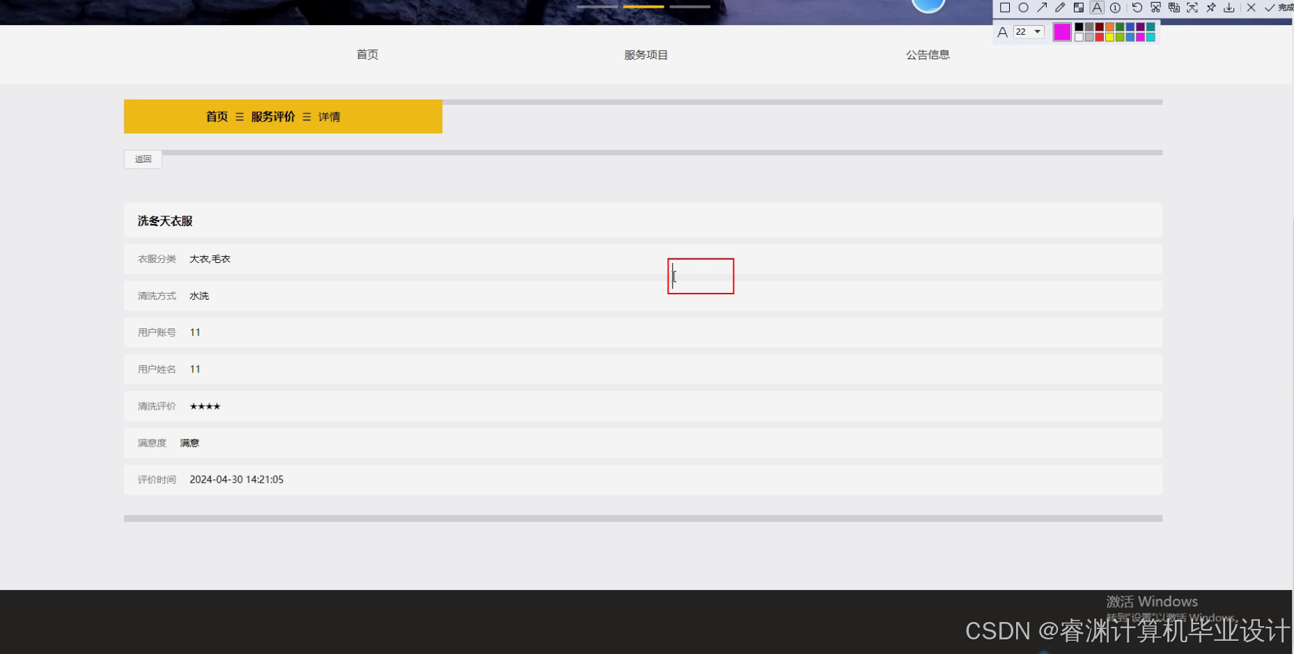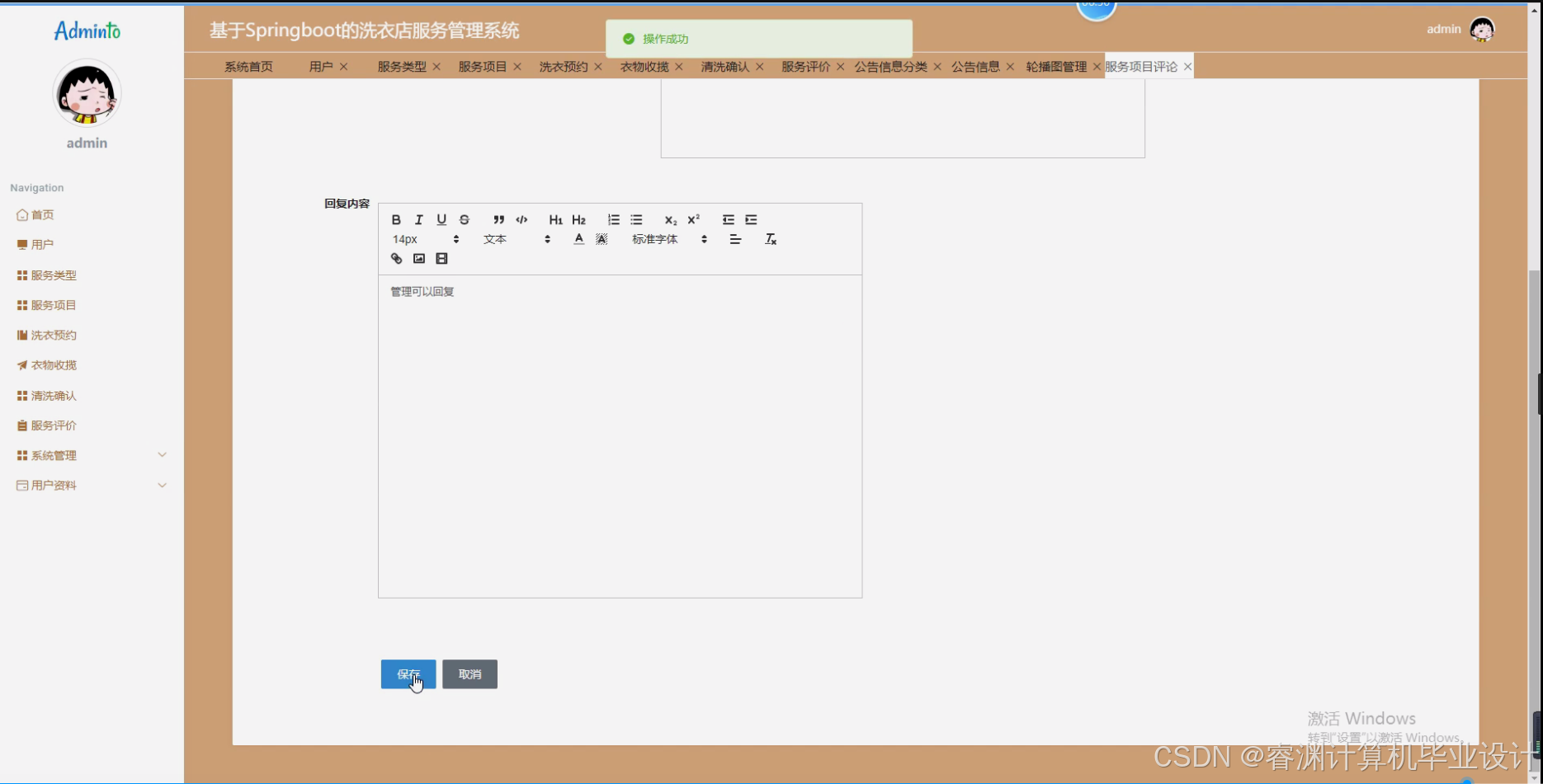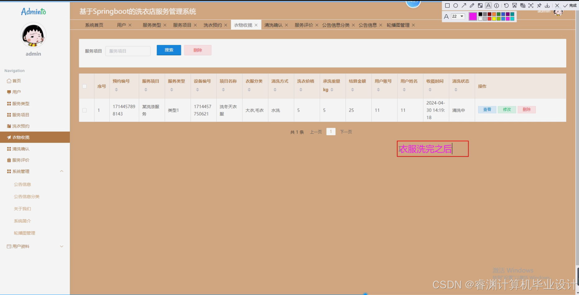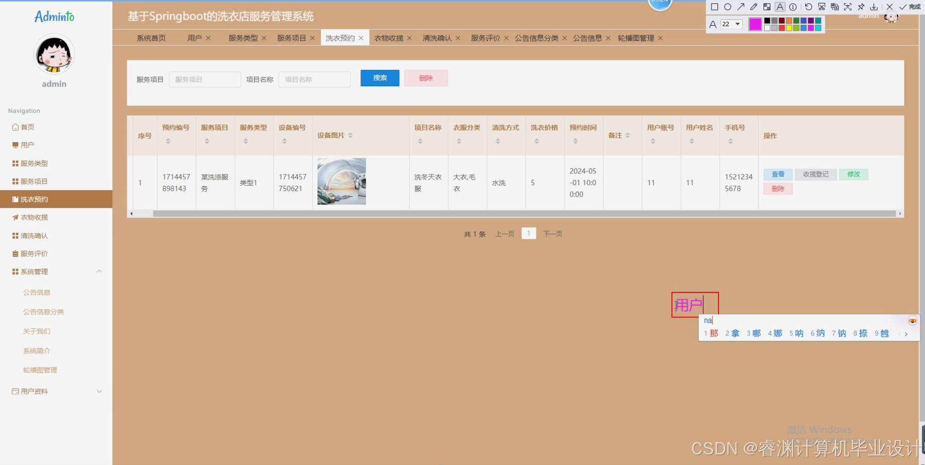 本研究将围绕洗衣店服务管理系统的设计与实现展开,具体内容包括:用户信息管理模块,用于记录和管理用户的个人信息、消费记录等;服务类型与项目展示模块,提供清晰的服务分类和详细的服务项目介绍,方便用户了解并选择所需服务;洗衣预约模块,支持用户在线预约洗衣时间、选择服务项目和衣物类型等;衣物收揽与追踪模块,实现衣物的线上收揽、清洗进度追踪和取件通知等功能;清洗确认模块,用于确认衣物清洗完成并通知用户取件;服务评价模块,允许用户对服务进行在线评价,为洗衣店提供改进服务的依据;线上理赔模块,处理因清洗导致的衣物损坏等理赔事宜,保障用户权益。此外,系统还将包含省份、地区等地理位置信息,以便用户根据所在位置选择附近的洗衣店。通过这些模块的设计与实现,构建一个功能全面、操作简便、用户体验优良的洗衣店服务管理系统。