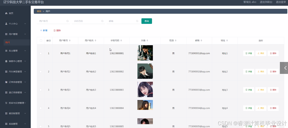 用户管理:在用户管理页面中可以查看用户账号、用户姓名、手机号码、头像、性别、邮箱、地址等内容,并进行详情,修改和删除等操作,如图4-10所示。