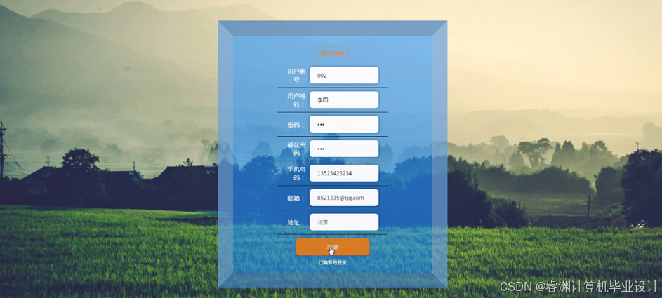 用户注册;在用户注册页面中输入用户账号、用户姓名、密码、确认密码、手机号码、邮箱、地址等内容进行注册操作;如图4-2所示。