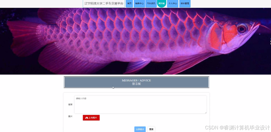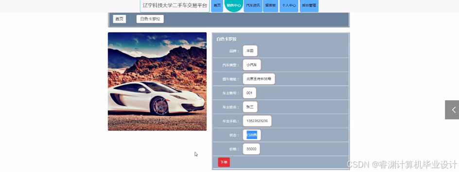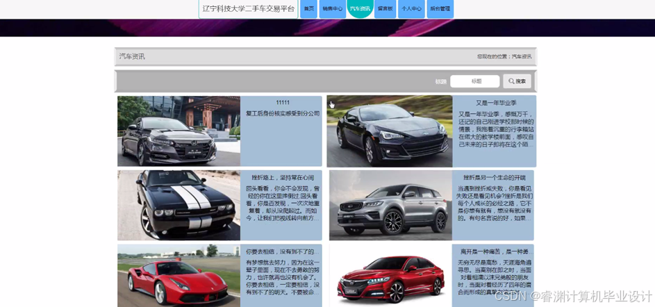 前台功能:用户进入系统可以实现首页、销售中心、汽车资讯、留言板、个人中心、后台管理等进行操作;