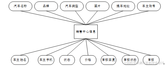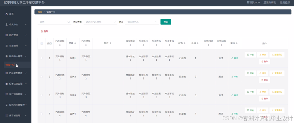 销售中心管理;在销售中心管理页面中可以查看汽车名称、品牌、汽车类型、图片、提车地址、车主账号、车主姓名、车主手机、状态、价格、审核回复、审核状态、审核等内容,并进行详情、修改和删除等操作;如图4-12所示。