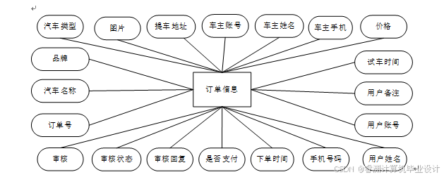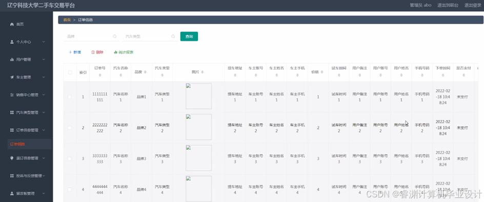 订单信息管理;在订单信息管理页面中可以查看订单号、汽车名称、品牌、汽车类型、图片、提车地址、车主账号、车主姓名、车主手机、价格、试车时间、用户备注、用户账号、用户姓名、手机号码、下单时间、是否支付、审核回复、审核状态、审核等内容,并进行修改和删除等操作;如图4-14所示。