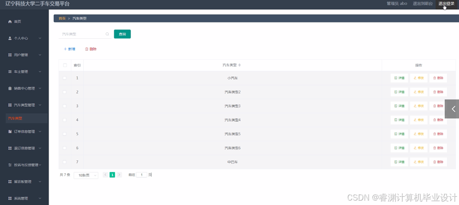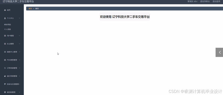 管理员登录进入辽宁科技大学二手车交易平台可以查看首页、个人中心、用户管理、车主管理、销售中心管理、汽车类型管理、订单信息管理、退订信息管理、投诉与反馈管理、留言板管理、系统管理等信息进行详细操作,如图4-9所示。