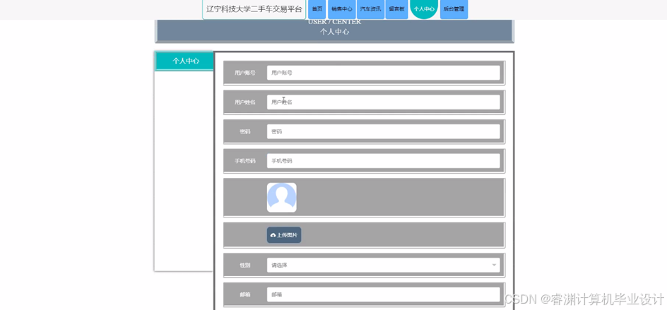 在个人中心页面中输入用户账号、用户姓名、密码、手机号码、头像、性别、邮箱、地址等内容进行更新信息,如图4-4所示。