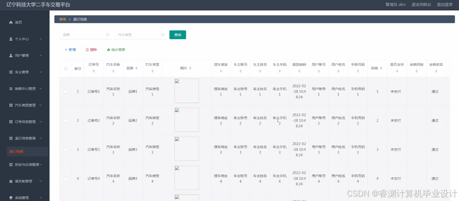 退订信息管理;在退订信息管理页面中可以查看订单号、汽车名称、品牌、汽车类型、图片、提车地址、车主账号、车主姓名、车主手机、退款时间、用户账号、用户姓名、手机号码、价格、是否支付、审核回复、审核状态、审核等内容,并进行修改和删除等操作;如图4-15所示。