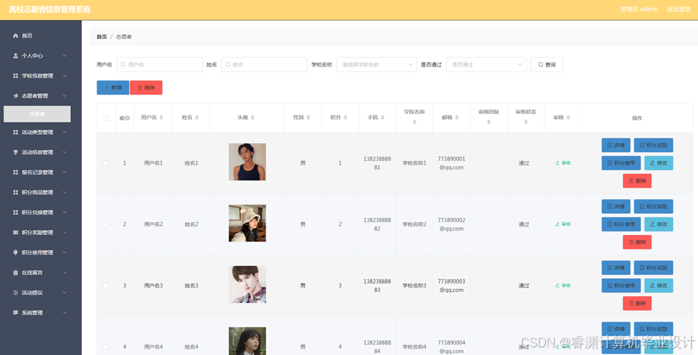 管理员点击志愿者管理。进入志愿者管理页面输入用户名、姓名、学校名称、是否通过可以查询,新增或删除志愿者详细信息,并进行详情,积分奖励,积分使用,修改或删除等操作。如图5-11所示: