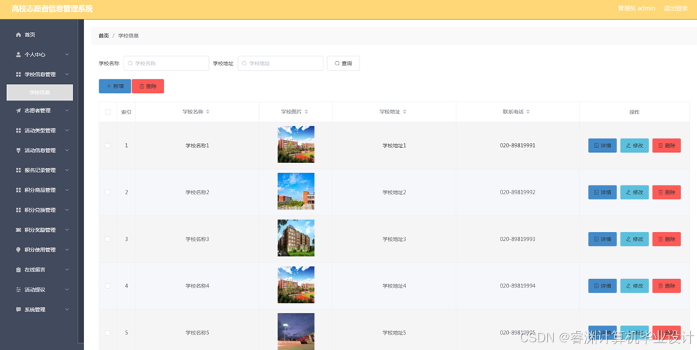 学校信息管理:管理员可以添加、修改、删除学校信息,包括学校名称、地址、联系方式等。