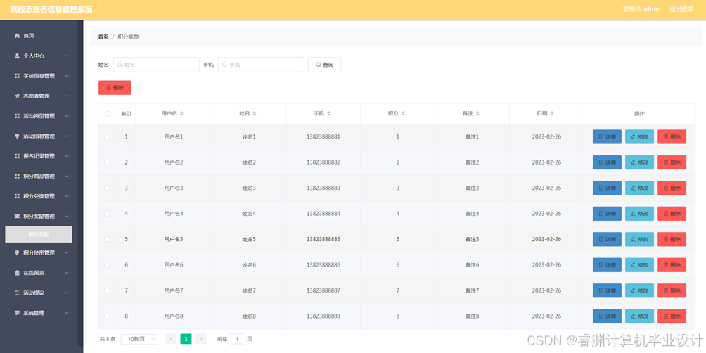 管理员点击积分奖励管理。进入积分奖励管理页面输入输入姓名、手机可以查询或删除积分奖励详细信息,并进行详情,修改或删除等操作。如图5-14所示: