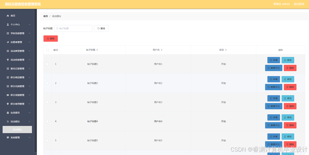管理员点击活动提议管理。进入活动提议管理页面输入帖子标题可以查询或删除活动提议详细信息,并进行详情,查看评论,修改或删除等操作。如图5-16所示:
