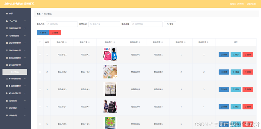 积分商品管理:管理员可以管理积分商品,包括商品名称、分类、积分值等。