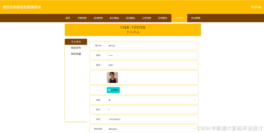 在个人中心页面输入用户名、密码、姓名、上传图片、性别、积分、手机、学校名称、邮箱等信息可以进行更新操作,还可对我的发布、我的收藏进行相应操作;如图5-7所示:
