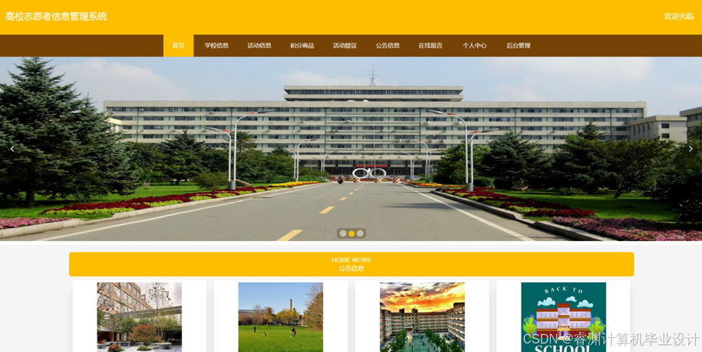 当人们打开系统的网址后,首先看到的就是首页界面。在这里,人们能够看到高校志愿者信息管理系统的首页、学校信息、活动信息、积分商品、活动提议、公告信息、在线留言、个人中心、后台管理等。系统首页界面如图5-1所示: