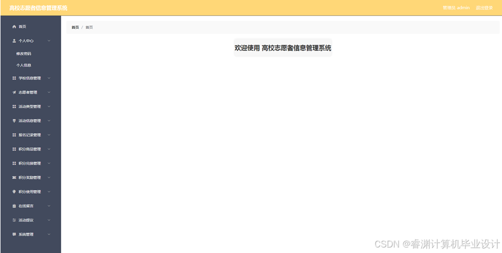 管理员进入主页面,主要功能包括对首页、个人中心、学校信息管理、志愿者管理、活动类型管理、活动信息管理、报名记录管理、积分商品管理、积分兑换管理、积分奖励管理、积分使用管理、活动提议、在线留言、系统管理等进行操作。管理员主页面如图5-9所示: