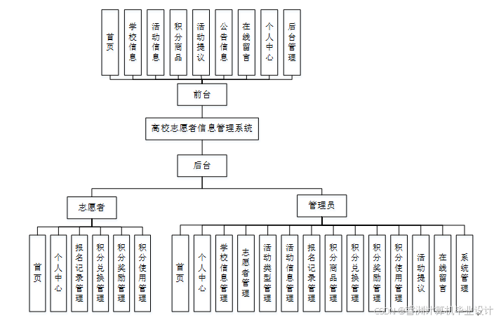 为了更好的去理清本系统整体思路,对该系统以结构图的形式表达出来,设计实现该高校志愿者信息管理系统的功能结构图如下所示: