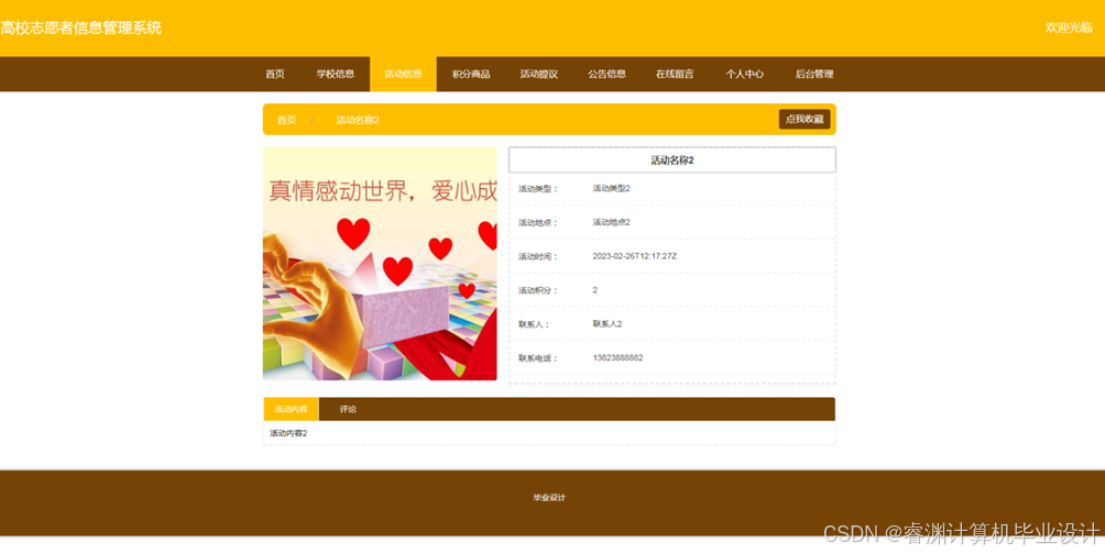 在活动信息页面可以查看活动名称、活动类型、活动地点、活动时间、活动积分、联系人、联系电话、活动内容、活动图片等详细信息,并进行报名、评论或收藏操作;活动信息页面如图5-3所示:
