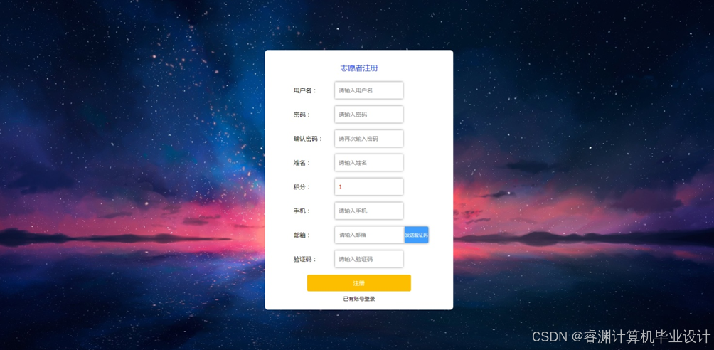 在志愿者注册页面的输入用户名、密码、确认密码、姓名、积分、手机、邮箱、验证码等信息进行注册操作,志愿者注册页面如图5-2所示: