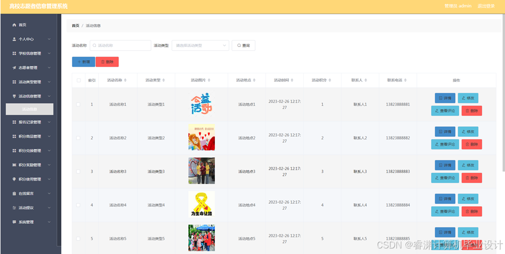 管理员点击活动信息管理。进入活动信息管理页面输入活动名称和选择活动类型可以查询,新增或删除活动信息详细信息,并进行详情,查看评论,修改或删除等操作。如图5-12所示: