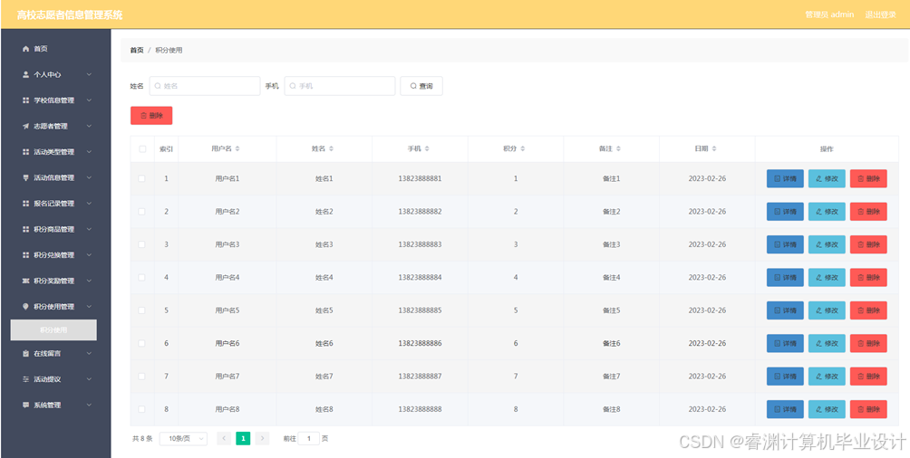 志愿者管理:管理员可以对志愿者信息进行管理,包括查看、修改、删除志愿者的详细信息。