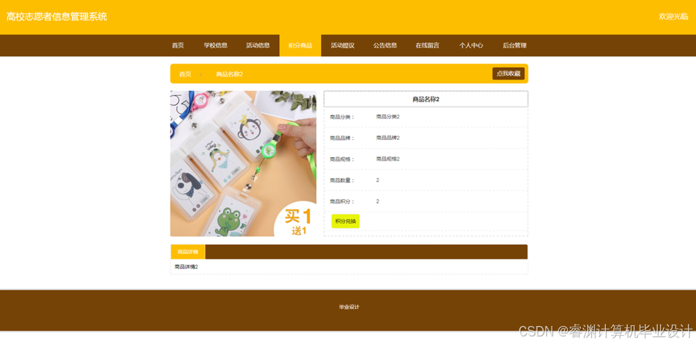 在积分商品页面可以查看商品名称、商品分类、商品品牌、商品规格、商品数量、商品积分、商品详情等详细信息,并进行积分兑换或收藏操作;积分商品页面如图5-4所示: