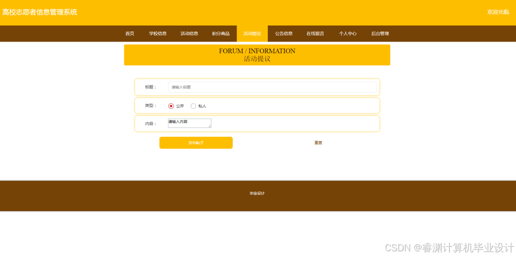 在活动提议页面的输入标题、类型、内容等信息进行发布帖子或重置操作;活动提议页面如图5-5所示: