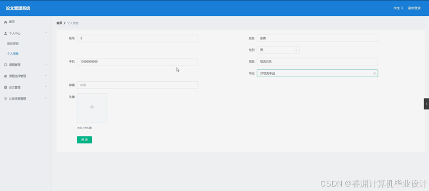 个人中心,在个人信息页面通过填写账号、姓名、手机、性别、班级、邮箱、专业、上传头像等内容并提交进行个人信息修改操作,如图5-12所示。