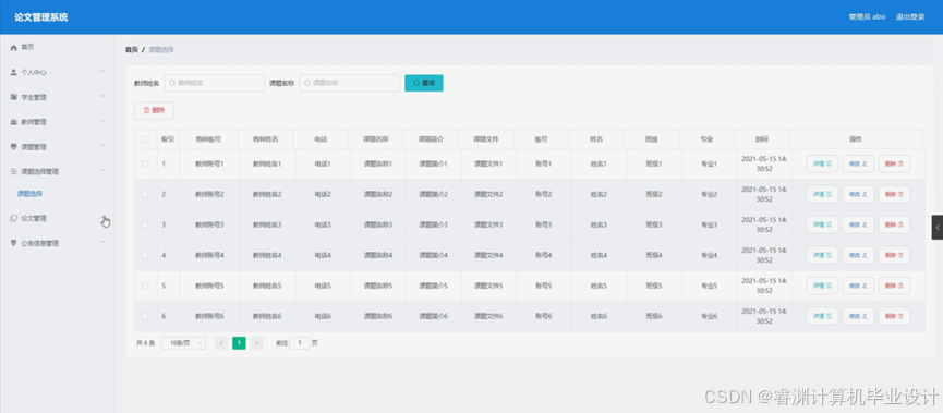 课题选择管理,在课题选择管理页面可以对索引、教师账号、教师姓名、电话、课题名称、课题简介、课题文件、账号、姓名、班级、专业、时间等内容进行详情,修改和删除等操作,如图5-8所示。
