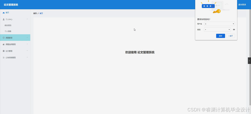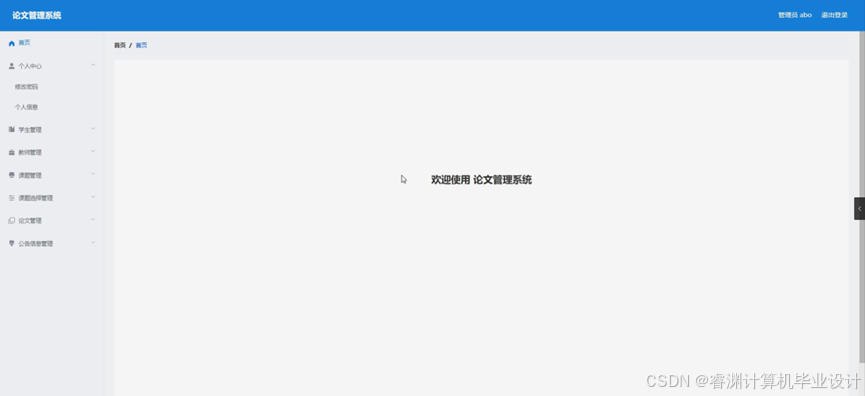 管理员登录系统后,可以对首页、个人中心、学生管理、教师管理、课题管理、课题选择管理、论文管理、公告信息管理等功能进行相应的操作管理,如图5-4所示。