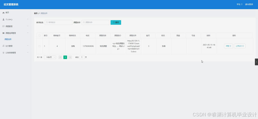 课题选择管理,在课题选择管理页面可以对索引、教师账号、教师姓名、电话、课题名称、课题简介、课题文件、账号、姓名、班级、专业、时间等内容进行详情或上传论文操作,如图5-14所示。