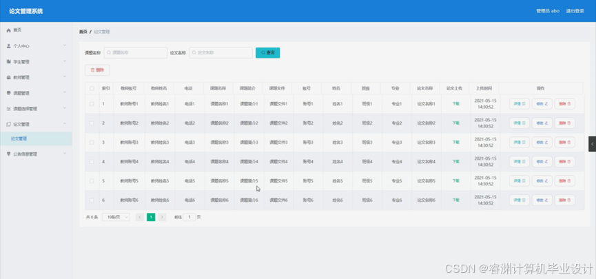 论文管理,在论文管理页面可以对索引、教师账号、教师姓名、电话、课题名称、课题简介、课题文件、账号、姓名、班级、专业、论文名称、论文上传、上传时间等内容进行详情,修改和删除等操作,如图5-9所示。
