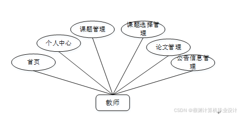 教师登陆后,主要包括首页、个人中心、课题管理、课题选择管理、论文管理、公告信息管理等功能。教师用例图如图3-2所示。