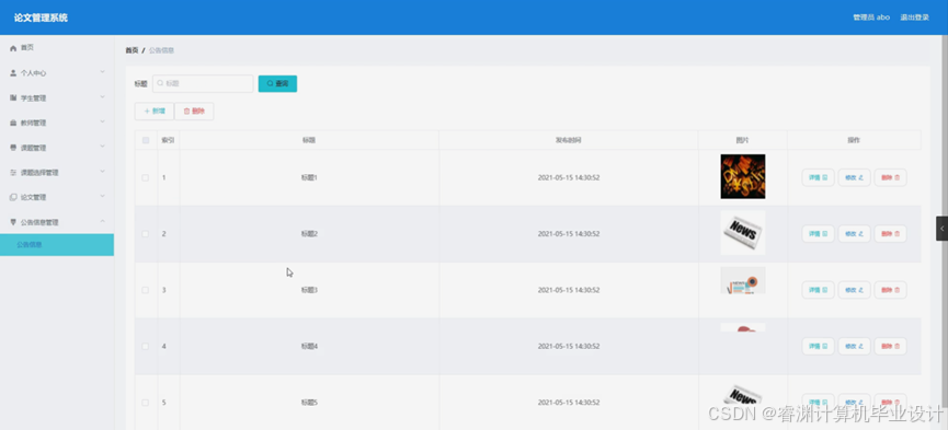 公告信息管理,在公告信息管理页面可以对索引、标题、发布时间、图片等内容进行详情,修改和删除等操作,如图5-10所示。