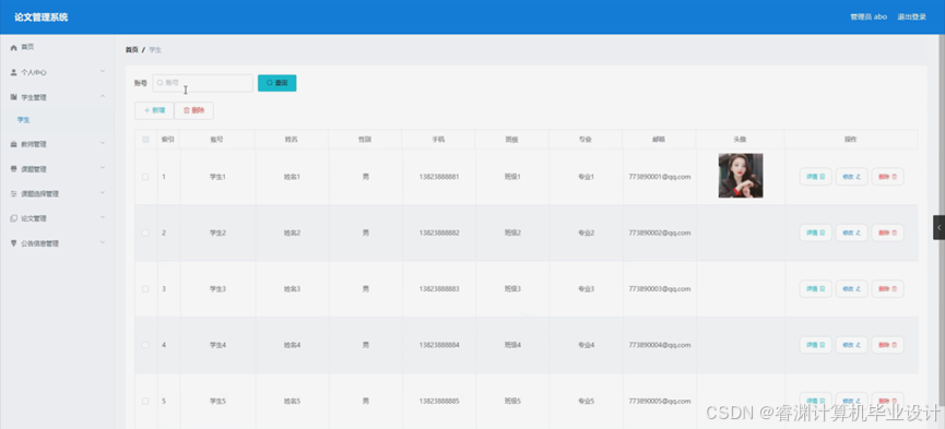 学生管理,在学生管理页面可以对索引、账号、姓名、性别、手机、班级、专业、邮箱、头像等内容进行详情,修改和删除等操作,如图5-5所示。