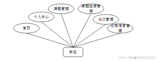学生登陆后,主要包括首页、个人中心、课题管理、课题选择管理、论文管理、公告信息管理等功能。学生用例图如图3-3所示。