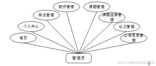 管理员登陆后,主要包括首页、个人中心、学生管理、教师管理、课题管理、课题选择管理、论文管理、公告信息管理等功能。管理员用例图如图3-1所示。