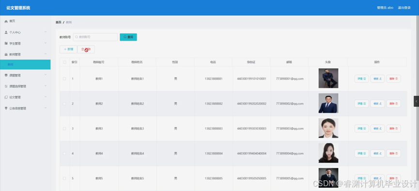 教师管理,在教师管理页面可以对索引、教师账号、教师姓名、性别、电话、身份证、邮箱、头像等内容进行详情,修改和删除等操作,如图5-6所示。