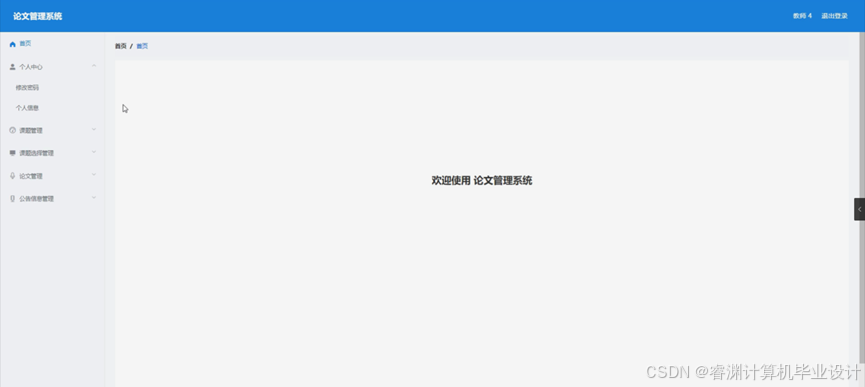 教师登录进入论文管理系统可以对首页、个人中心、课题管理、课题选择管理、论文管理、公告信息管理等功能进行相应操作,如图5-15所示。