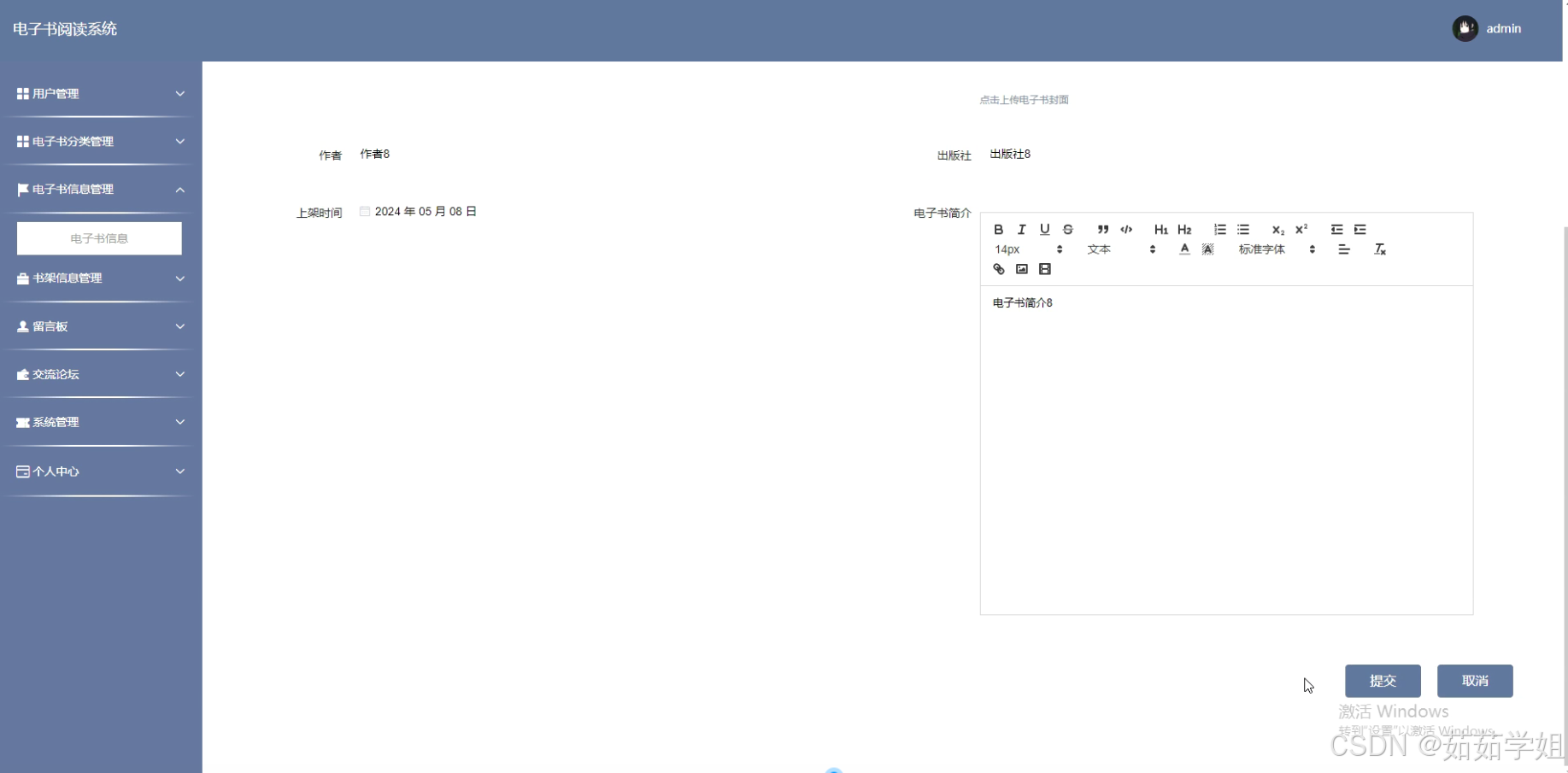 - 基本信息录入:对于每一本电子书,系统要准确录入其基本信息,包括书名、作者、出版社、出版日期、ISBN码等。这些信息是用户了解电子书的重要依据,也是系统进行分类和检索的基础。