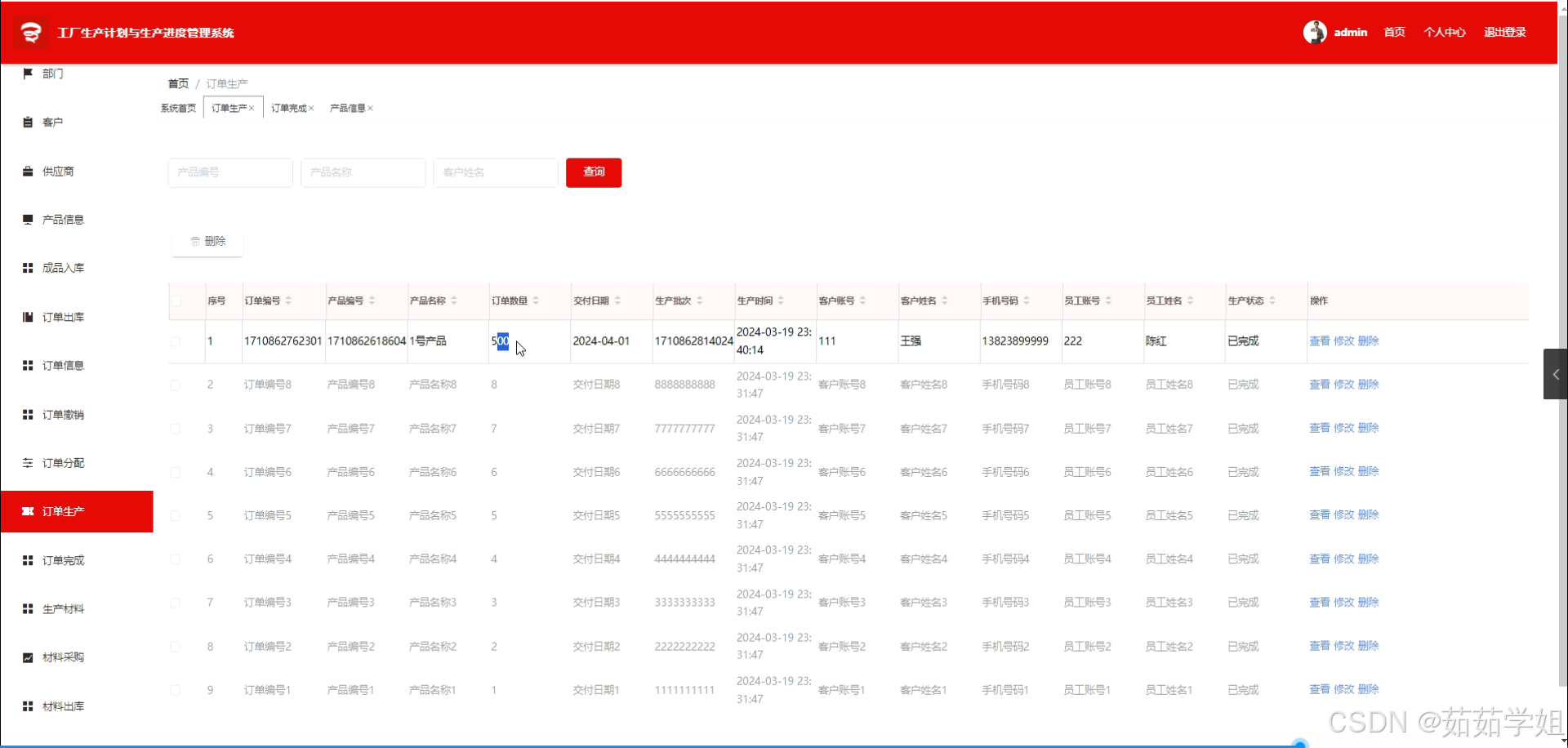 - 该系统将具备员工、部门、供应商、客户、产品信息、成品入库、生产材料、订单信息、材料采购、材料出库、订单撤销、订单分配、订单生产、订单完成、订单出库、公告信息等全面的管理功能。能够实现生产计划的科学制定、生产进度的实时监控、企业资源的有效整合等目标。