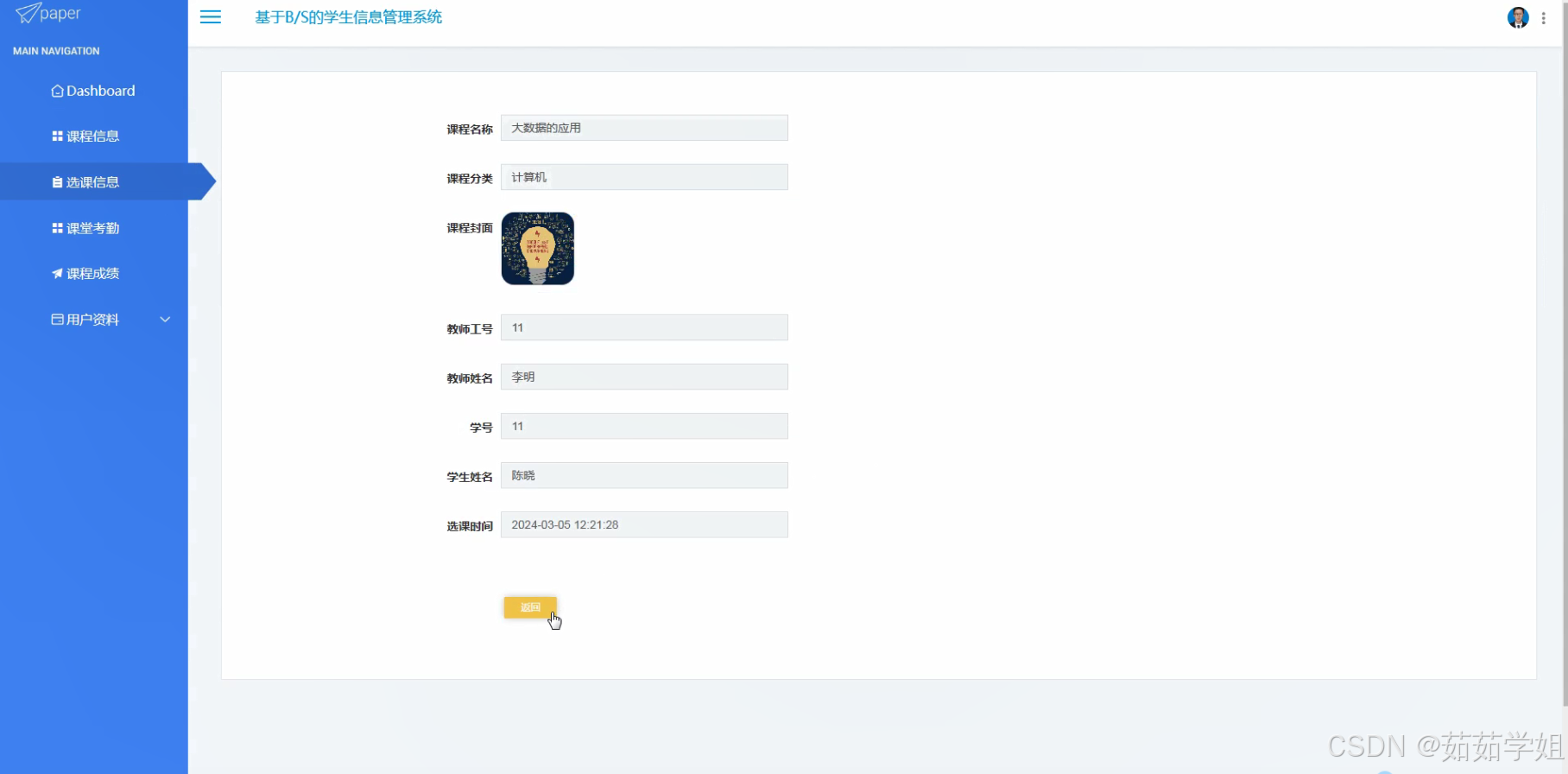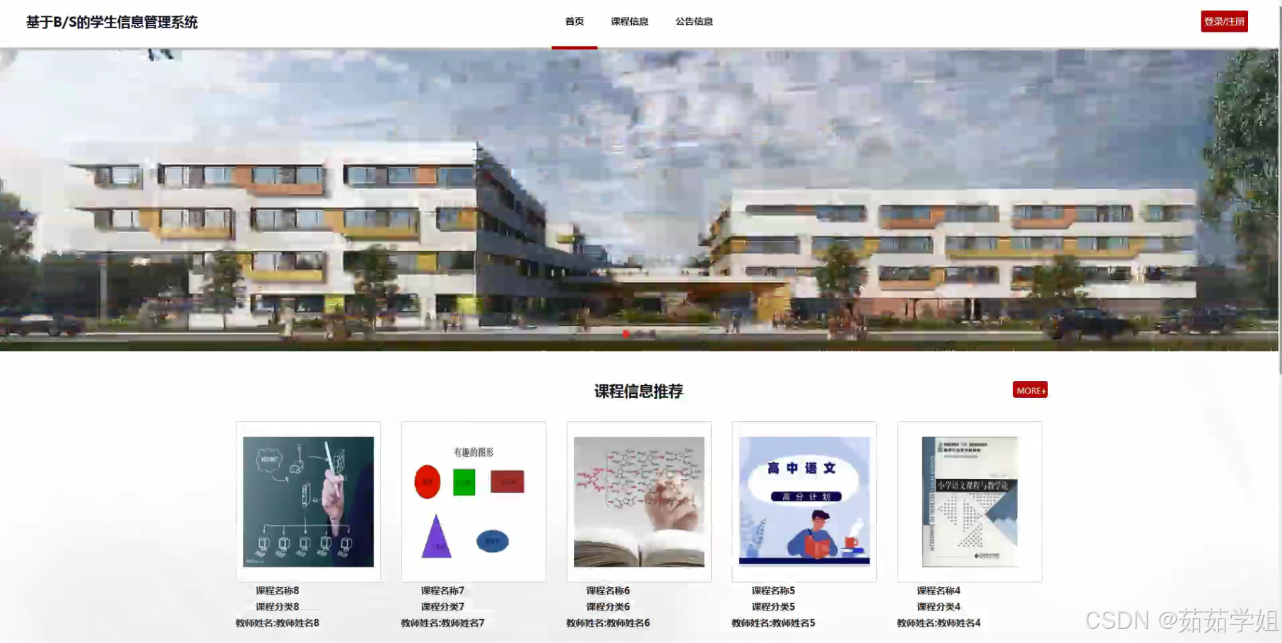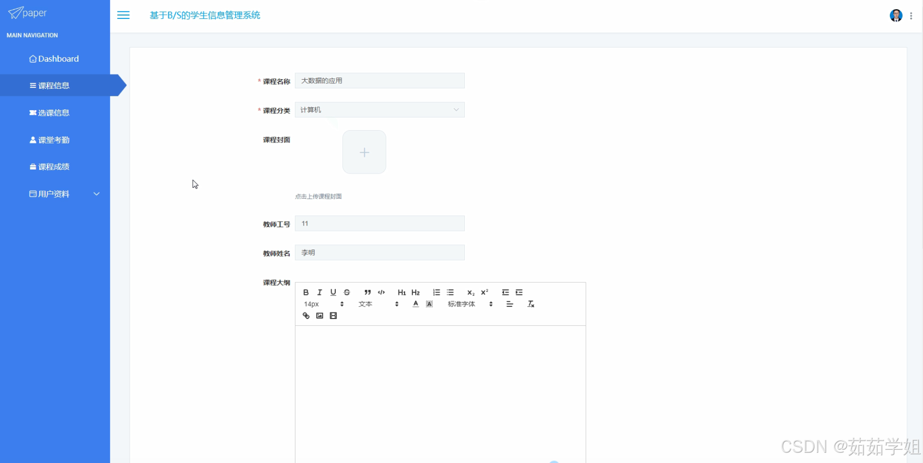 - 一个完整的基于B/S的学生信息管理系统:该系统具备教师、学生、课程信息、选课信息、课堂考勤、课程成绩、课程分类、学生档案等功能模块,能够满足学校日常教学管理的需求。