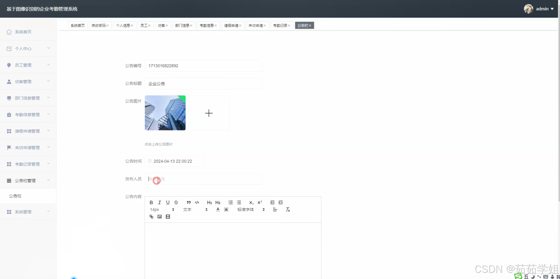 本研究旨在构建一个基于图像识别的企业考勤管理系统。通过该系统实现员工考勤的自动化管理,提高考勤信息的准确性和实时性。同时,将请假申请、访客来访等相关功能纳入系统,实现企业内部人员与外部访客管理的一体化。整合部门信息,方便企业进行组织架构管理,并且利用公告栏功能实现企业内部信息的高效传播,提升企业整体管理效率和信息流通的速度。