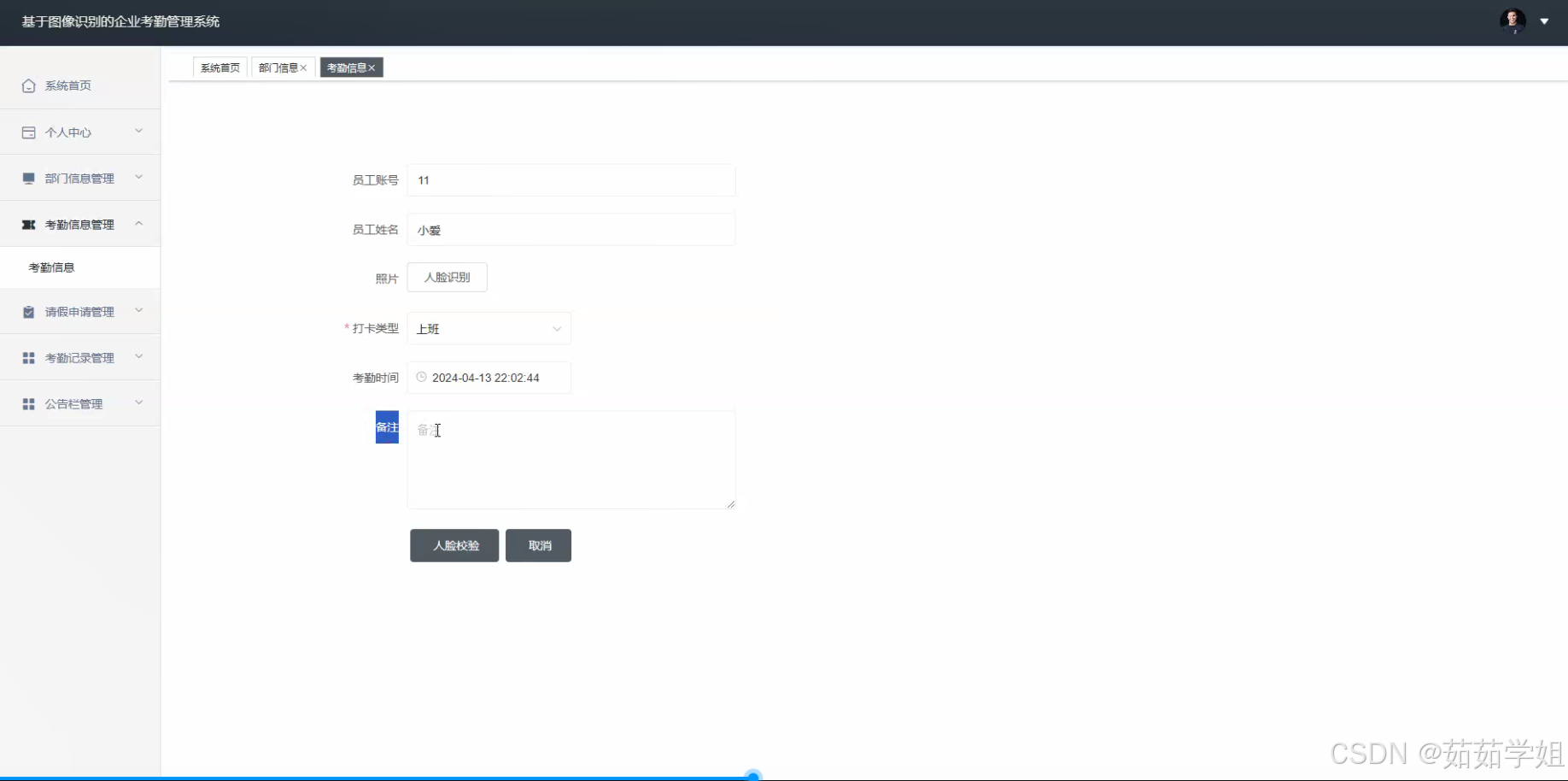 - 系统原型:成功开发出基于图像识别的企业考勤管理系统原型,该原型具备员工考勤、请假申请、访客管理、部门信息整合、公告栏等功能,并且各功能模块之间能够正常交互和协同工作。