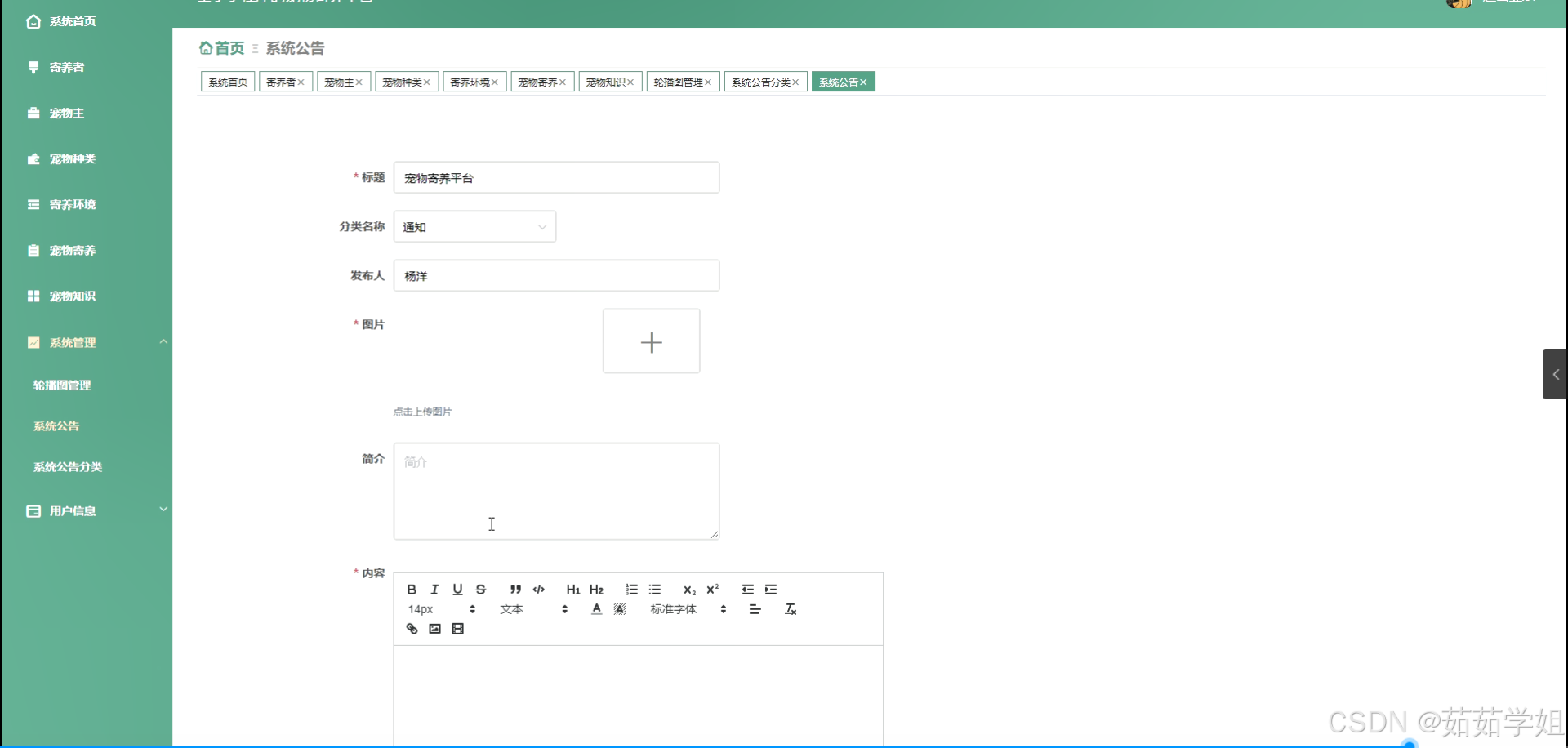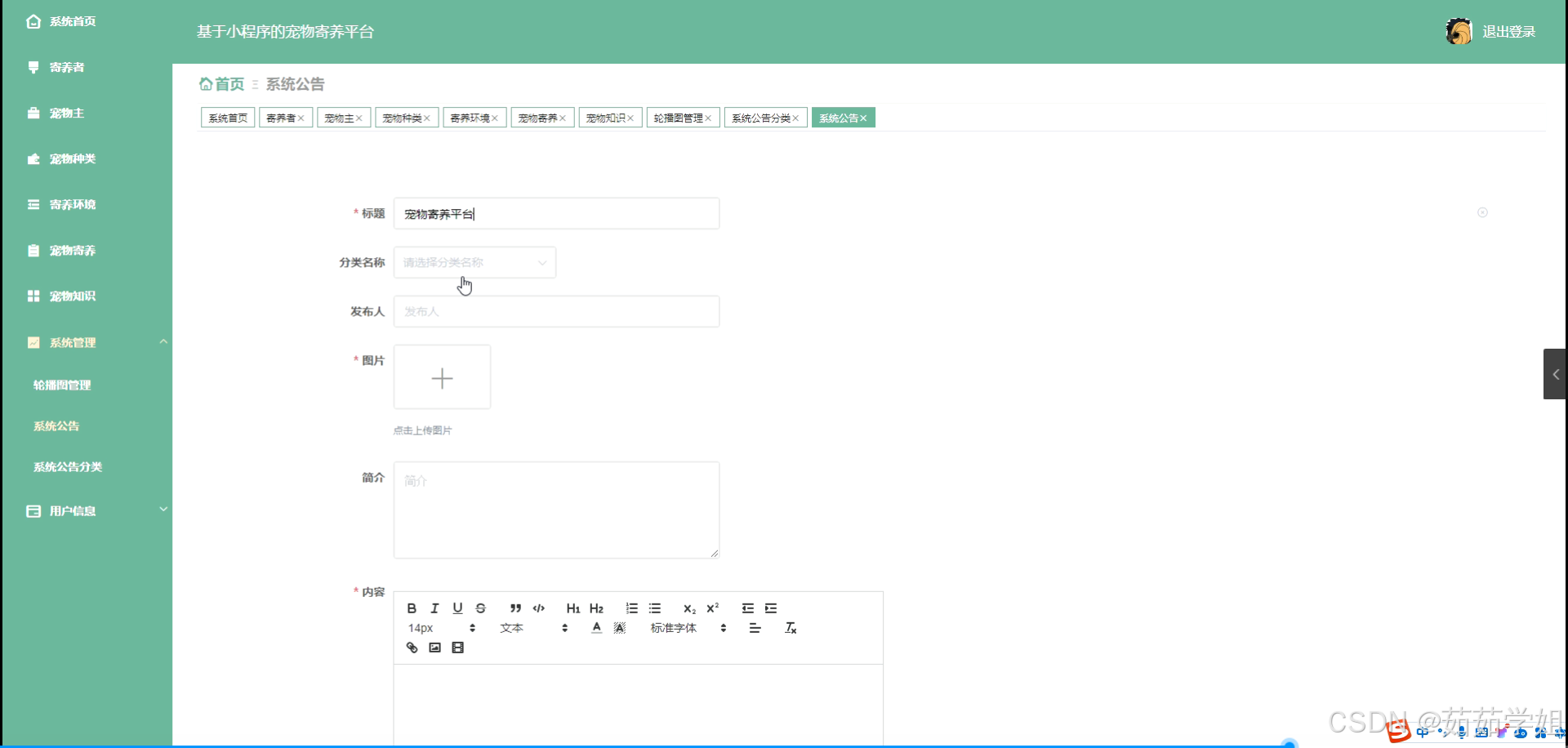 - 宠物知识传播不足问题:很多宠物主和寄养者缺乏必要的宠物知识,影响宠物的健康和养护。平台设置宠物知识管理功能,通过知识分类整合、个性化推送、互动交流等方式,加强宠物知识的传播和普及。