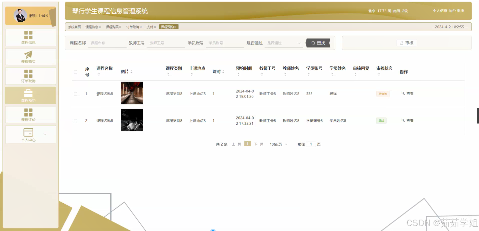 - 教师管理:存储教师的基本信息,如姓名、年龄、教学经验、专业资质等;同时记录教师的教学安排,包括所授课程、授课时间等信息。这有助于琴行合理安排教师资源,也方便学员选择适合自己的教师。