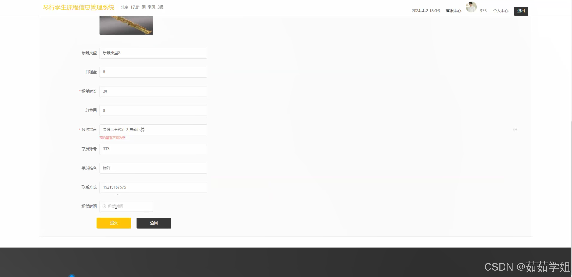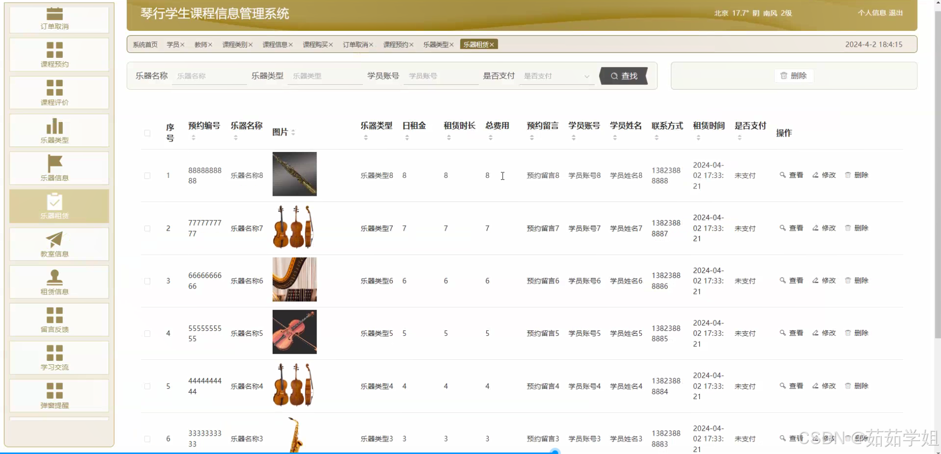 - 乐器租赁:实现乐器租赁业务的信息化管理,包括租赁订单的生成、租赁时间的记录、租赁费用的计算等。