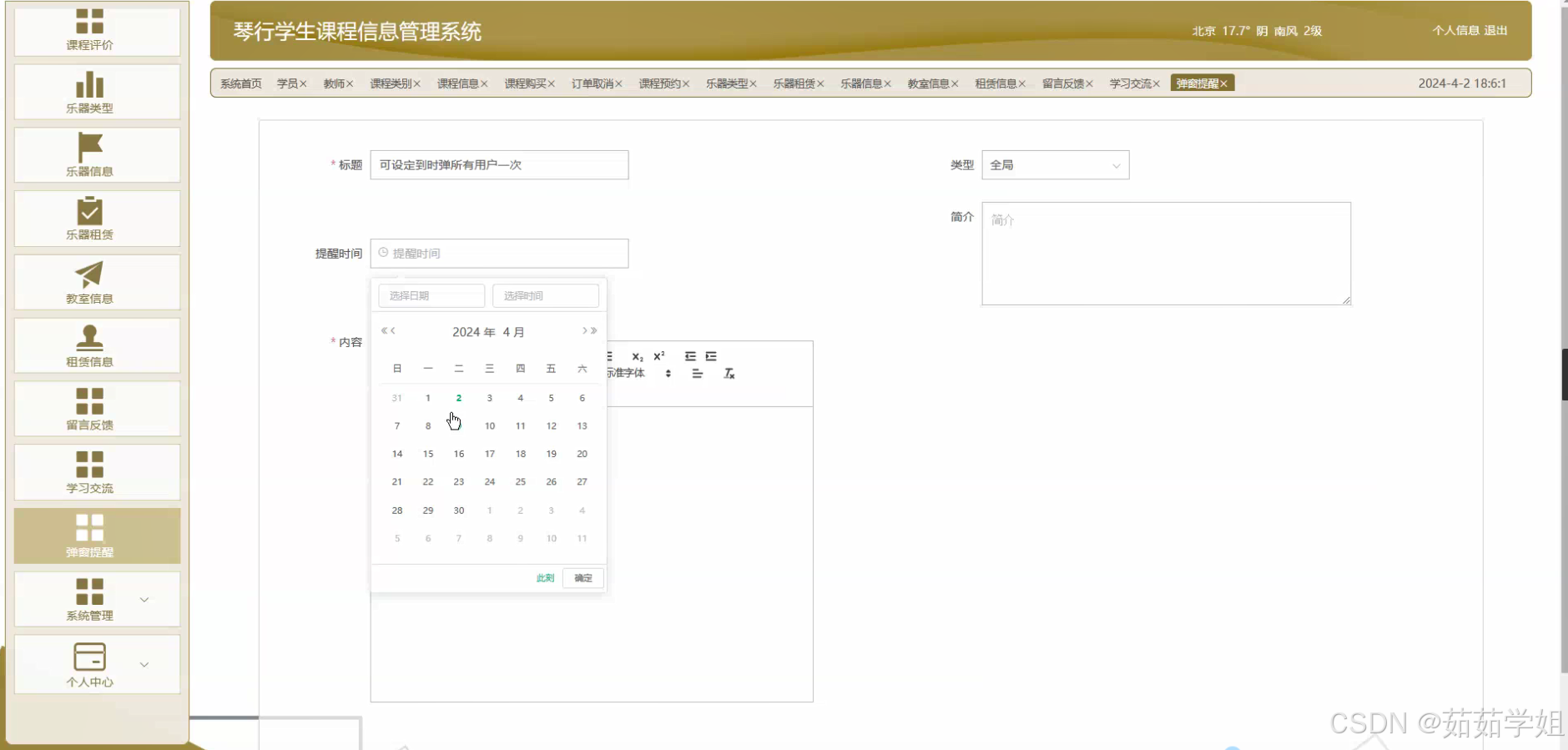 - 课程评价:学员在完成课程学习后,可以对课程内容、教师教学质量等进行评价。琴行可以根据学员的评价来改进教学质量,优化课程设置。